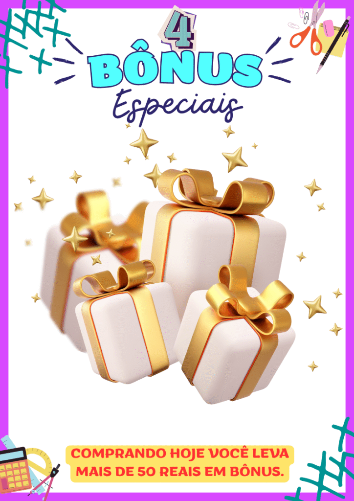 Além do kit completo, você ainda recebe 4 presentes exclusivos para deixar o momento de ensinar muito mais leve, prático e divertido – sem pagar nada mais por isso.